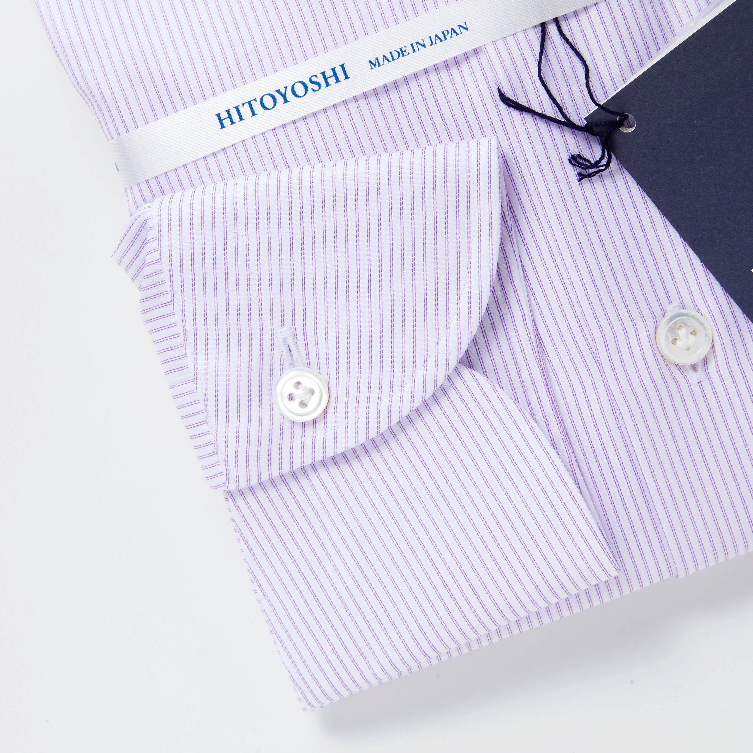 裏前立て仕様でカフスは手首に向かって先が細くなった円錐カフスにボタンは、白蝶貝に鳥足ボタン付けという業界に少なからずインパクトを与えHITOYOSHIの名を高めたこだわりの仕様となっています。